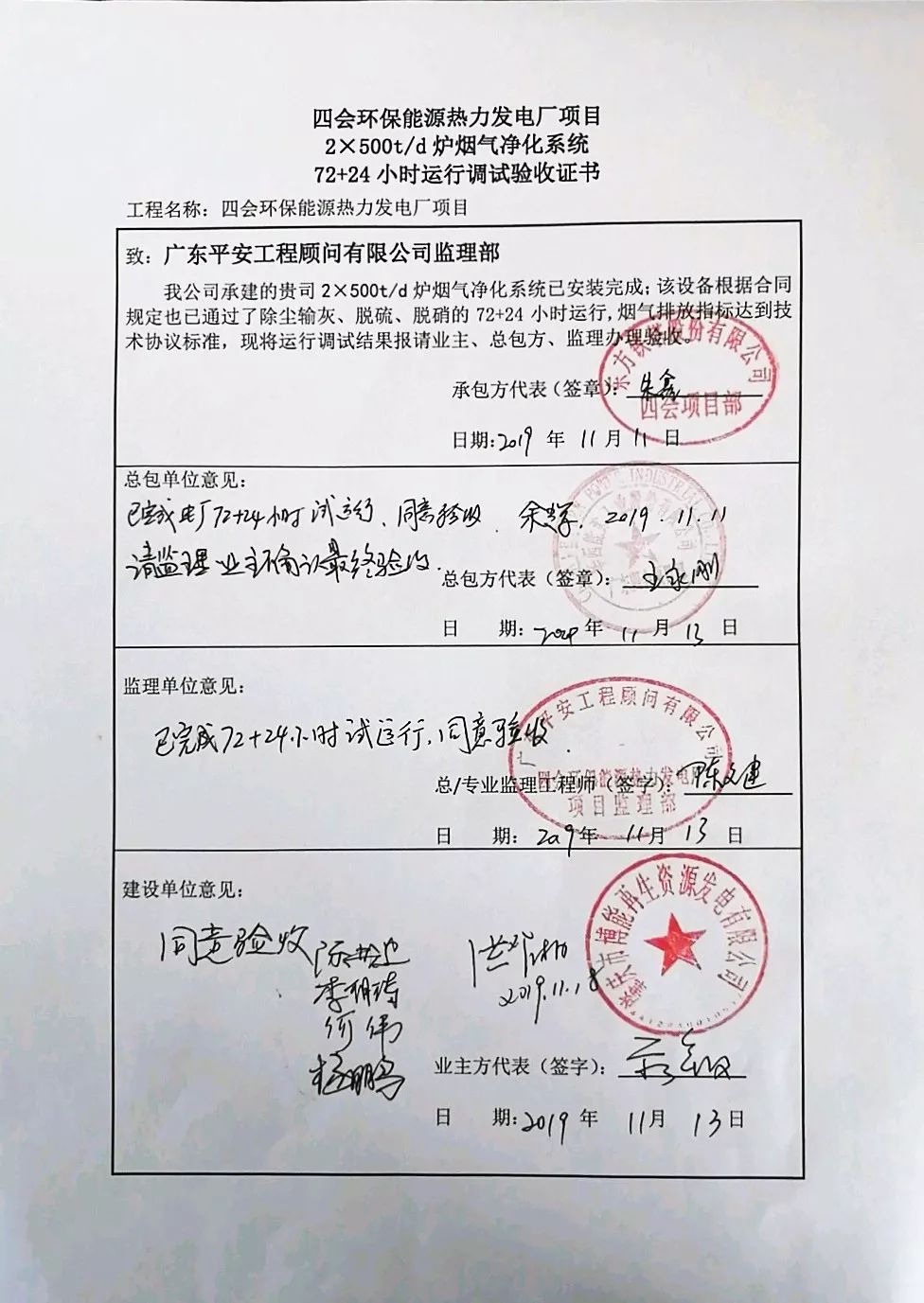 我公司承建的四會環(huán)保能源熱力發(fā)電廠項目煙氣凈化工程于2019年11月11日通過72+24小時運行驗收。