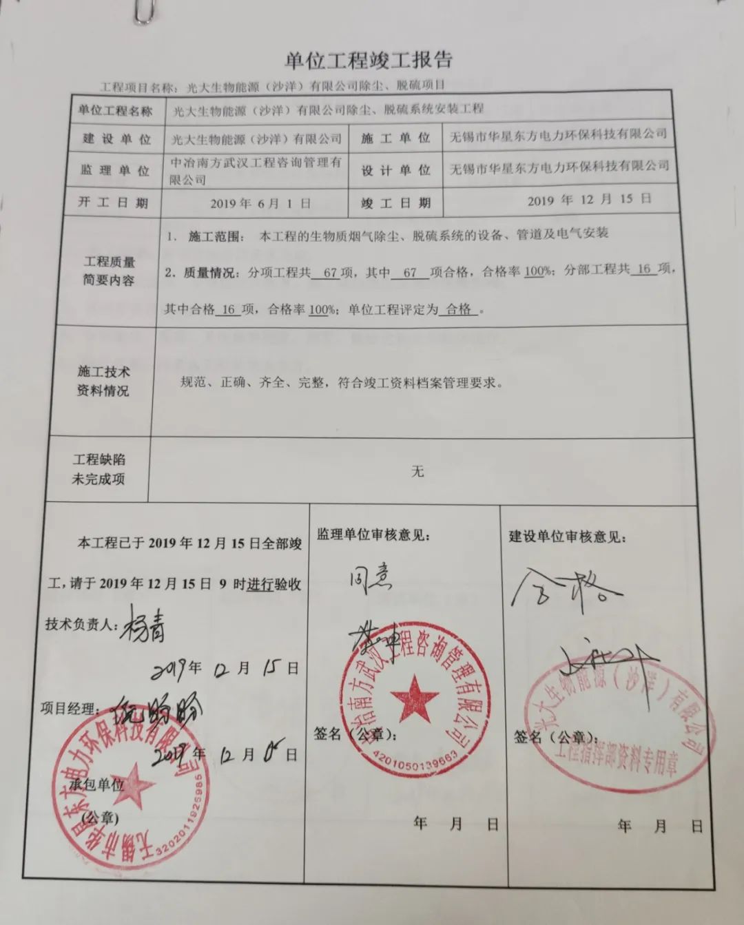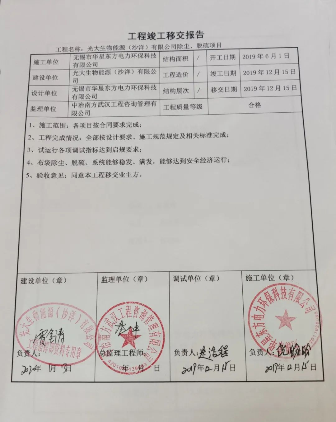 我公司承建的光大沙洋生物質(zhì)發(fā)電項目煙氣凈化工程于2019年12月15日通過竣工驗收。